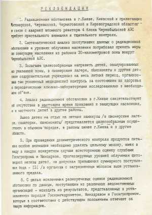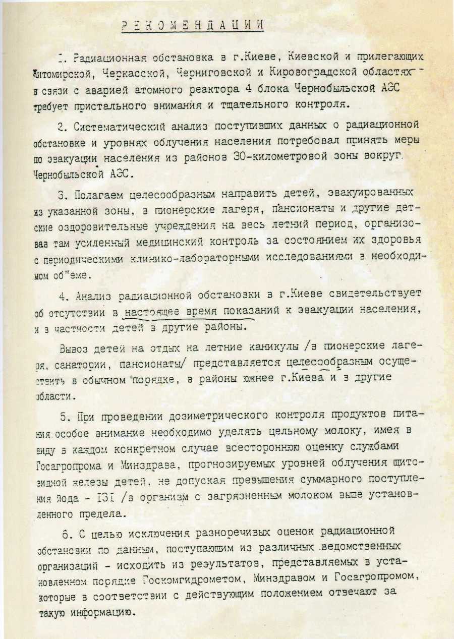 «На историческом заседании Политбюро ЦК Компартии Украины 7 мая 1986 г., где решался вопрос об эвакуации жителей Киева, В.Вю Щербицкий попросил изложить на бумаге нашу твердую позицию против эвакуации населения города. Свое солидарное заключение и рекомендации мы писали в отдельном кабинете пять часов — до 11 часов ночи 7 мая. Точнее, все писал Юрий Антониевич, который, как известно, обладал блестящими способностями подготовки документов государственной значимости. В один из коротких перерывов, задумавшись на несколько минут, он неожиданно сказал: «Составляя этот поистине исторический документ, я вдруг вспомнил одну из, может быть, грубых аналогий. Ты помнишь, когда неменцкие войска, ломая сопротивление Красной Армии в 41-м году, вплотную подошли к Москве, Сталин позвонил Жукову и спросил его: «Скажите, товарищ Жуков, откровенно, как коммунист коммунисту, мы отдадим Москву?» «Ни в коем случае», — ответил Георгий Константинович». В 23 часа 7 мая мы вошли в кабинет В.В. Щербицкого, и Юрий Антониевич передал наше заключение и рекомендации». (Леонид Ильин, академик РАМН, доктор медицинских наук, профессор, Герой Соцтруда).